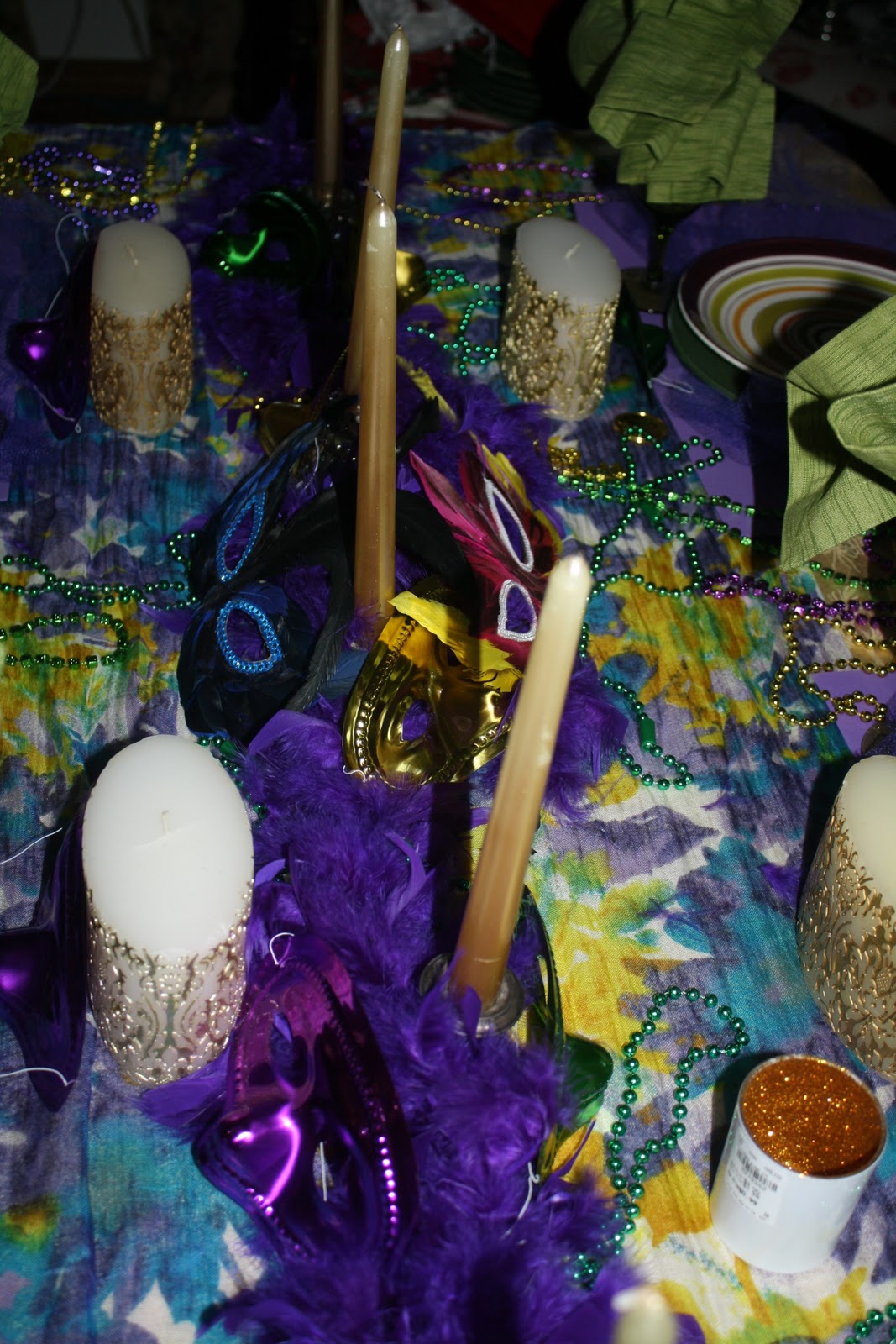 I used gold candles I bought on clearance after Thanksgiving, along with masks and beads I got at the Dollar Store.