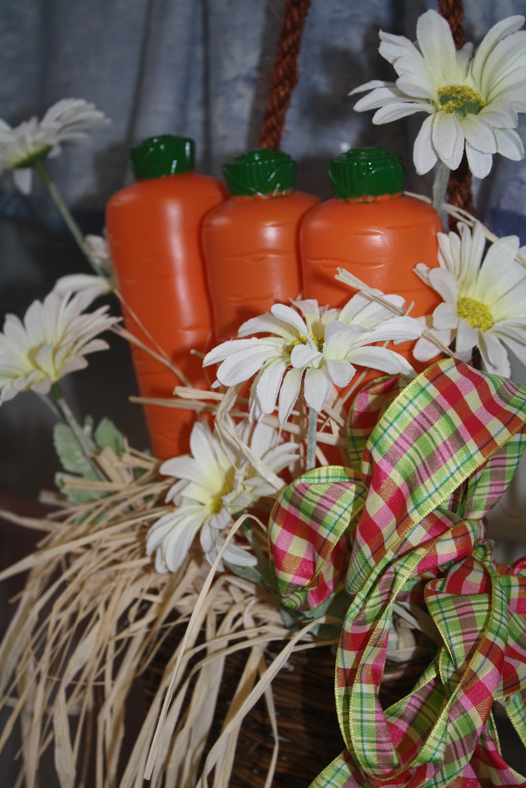 On the back door I used the other basket, added some more carrots, but used some daisies and a plaid ribbon. Once again, for under $8 I have a cute welcome-spring basket. I will redo it in a few weeks to welcome early summer.